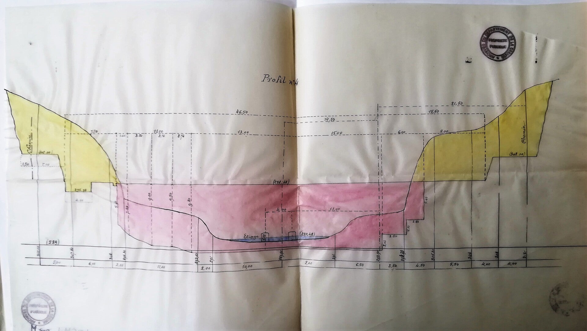 Les plans du projet approuvé et en cours d'exécution, dont les parties essentielle, ont été donnés par l'entrepreneur G. DUMAS à Limoges, comportent à ce point de vu un passage, dont nous donnons ci joint, le profil en long, le plan et cinq coupes.